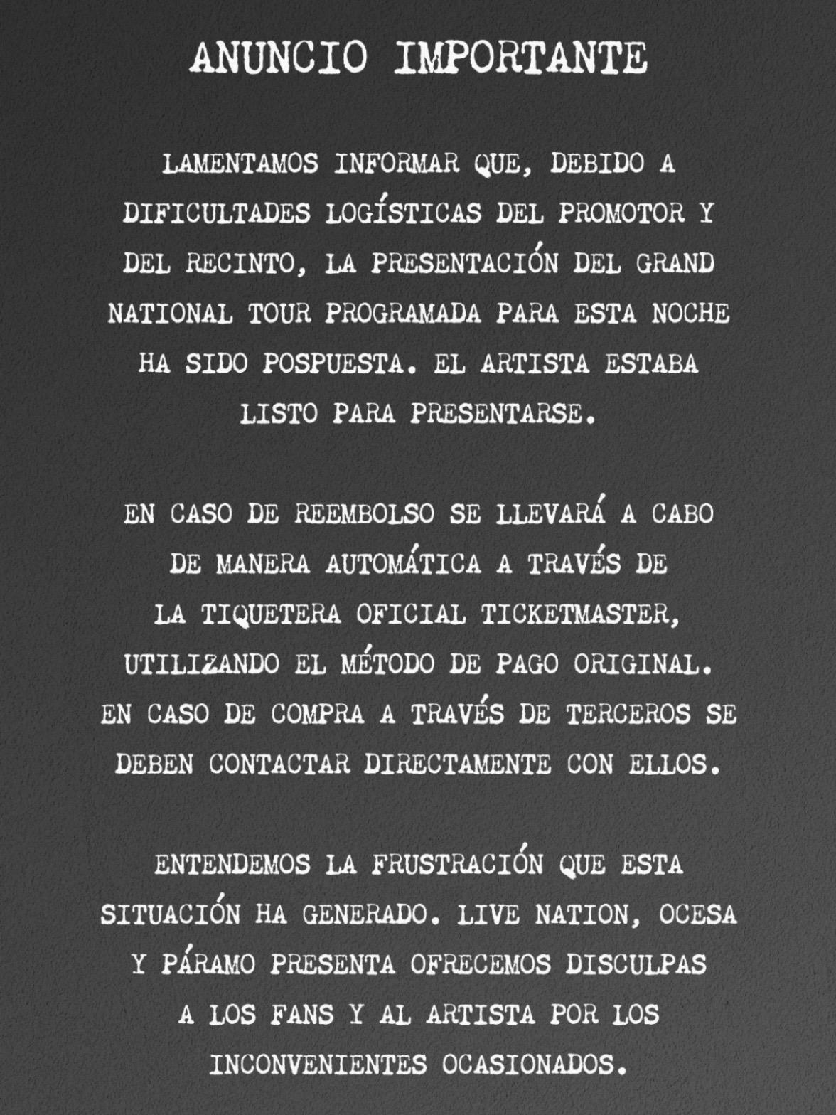 La escena cambió por completo cuando, horas antes del concierto, los organizadores confirmaron que el evento debía posponerse. A través de un comunicado oficial, Live Nation, OCESA y Páramo Presenta informaron que por motivos logísticos relacionados con el promotor y el recinto no era posible llevar a cabo el espectáculo en la fecha prevista.
